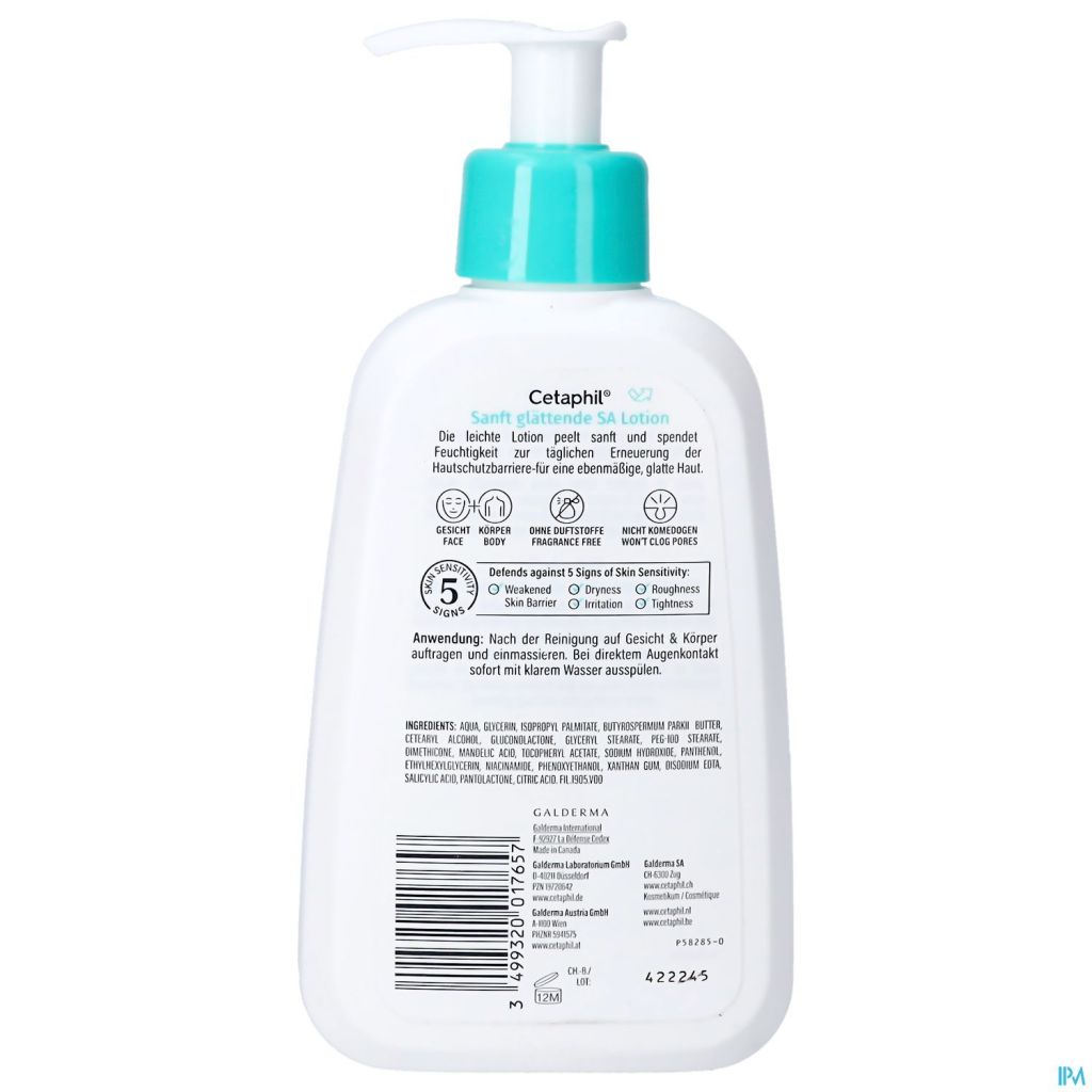 Deze lichtgewicht lotion is hypoallergeen, parfumvrij, parabenenvrij en verstopt de poriën niet. Cetaphil Gentle Exfoliating SA Lotion beschermt tegen 5 tekenen van een gevoelige huid: Droogheid, irritatie, ruwheid, trekkerigheid en een verzwakte huidbarrière.