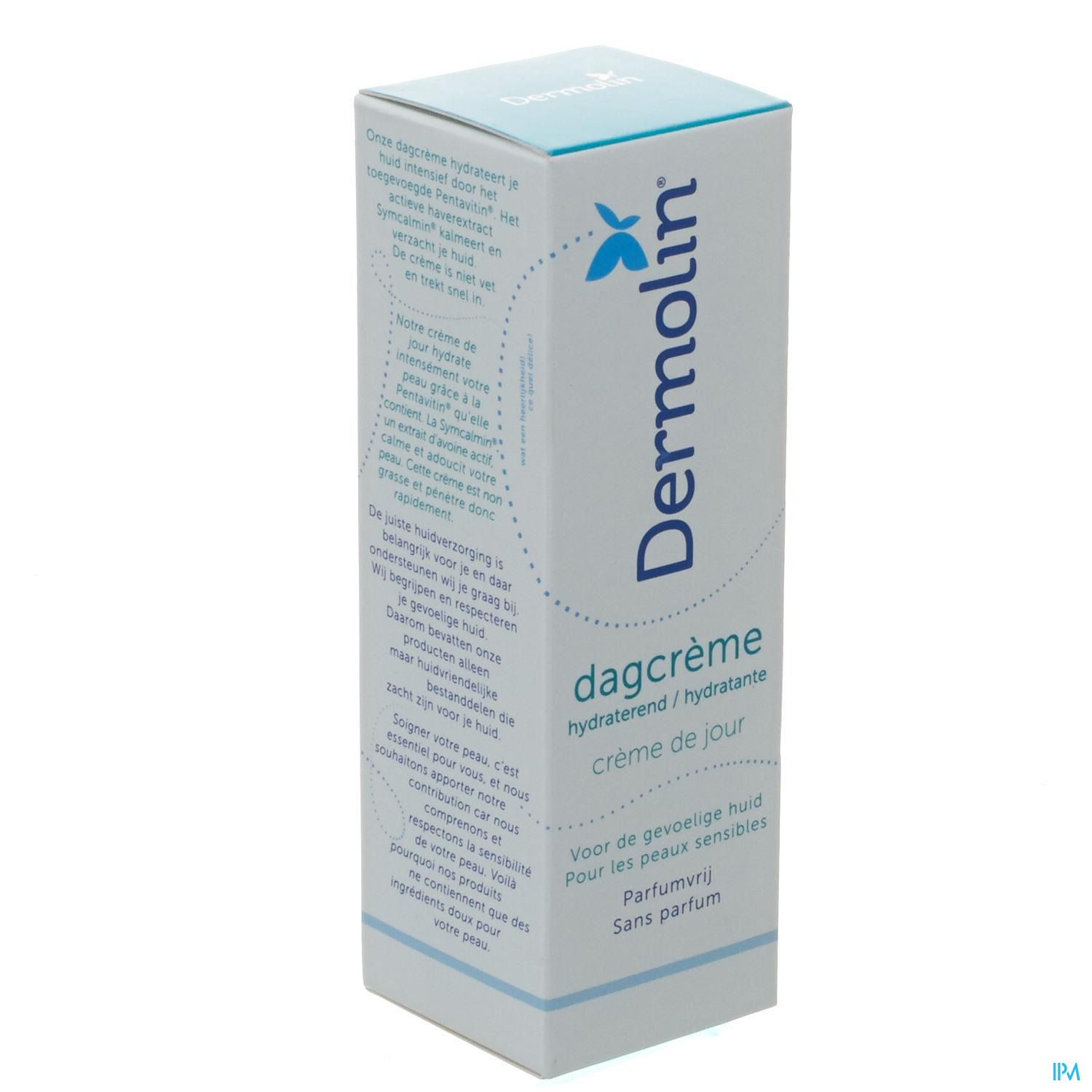Dermolin dagcrème verzorgt en beschermt de huid optimaal gedurende de dag. De hydraterende dagcrème is verrijkt met Symcalmin®, afgeleid van een haverextract, voor een kalmerende en verzachtende werking. Symcalmin® heeft ook specifieke eigenschappen tegen jeuk en irritatie. Het ingrediënt Pentavitin® herstelt de natuurlijke vochtbalans van de huid, zowel aan de oppervlakte als in de dieper gelegen huidlagen. De dagcrème vormt een zacht, nauwelijks zichtbaar laagje op de huid, dat uitdroging helpt voorkomen. Voor optimale verzorging is een combinatie met de rijke Dermolin nachtcrème aan te raden.