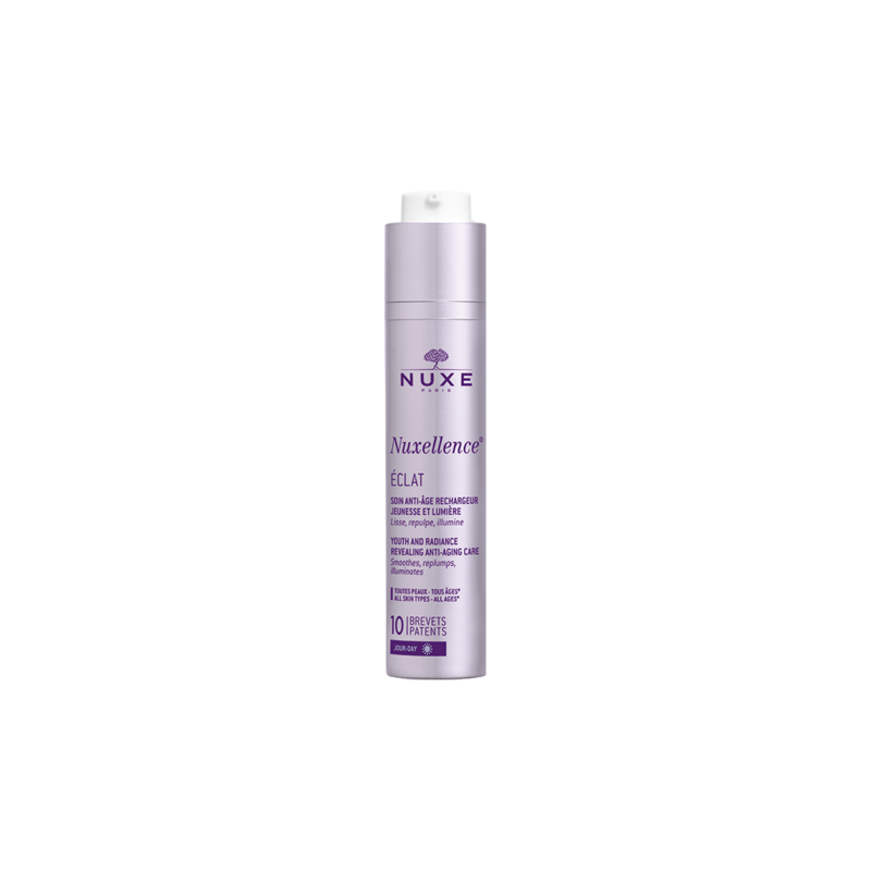 patenten, bevat onder meer Passiebloem en Hyaluronzuur en werkt in op de kern van de huidcellen, zodat ze een optimaal energieniveau kunnen handhaven (1). De huid straalt en lijkt jonger. De textuur, verrijkt met corrigerende pigmenten, verheldert de huid onmiddellijk. Nuxellence® Jeunesse wordt Nuxellence® ECLAT (nieuwe naam en verpakking maar Zelfde formule)