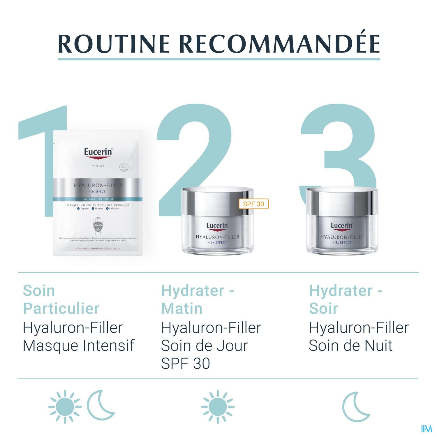 Hyaluron-filler Hyaluronzuur Intensief Masker op basis van hoog- en laagmoleculair Hyaluronzuur. Hoogmoleculair Hyaluronzuur verbetert de hydratatie en maakt de buitenste huidlagen glad, terwijl laagmoleculair Hyaluronzuur, dat 40 keer fijner is, dieper doordringt in de epidermale huidlagen waar de diepere rimpels ontstaan.