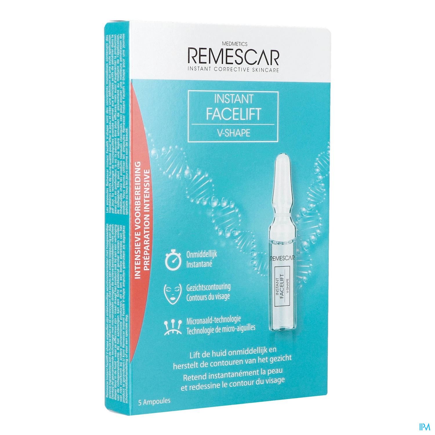 Remescar Instant Facelift V-Shape bestaat uit 5 ampullen die elk een hoge concentratie aan actieve ingrediënten bevatten. Door de unieke Microneedling Technologie dringen deze actieve ingrediënten tot 10 000 keer dieper in de huid in vergelijking met andere producten die op de huid worden aangebracht. De effectiviteit van deze ampullen is bijgevolg heel hoog.