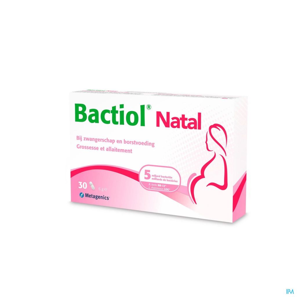 Bactiol® Natal werd speciaal ontwikkeld voor zwangere vrouwen en voor vrouwen die borstvoeding geven. Eén capsule bevat 5 miljard levende bacteriën (een mix van Bifidobacterium lactis BB-12® en Lacticaseibacillus rhamnosus LGG®. Beide stammen zijn het onderwerp van talrijke studies.