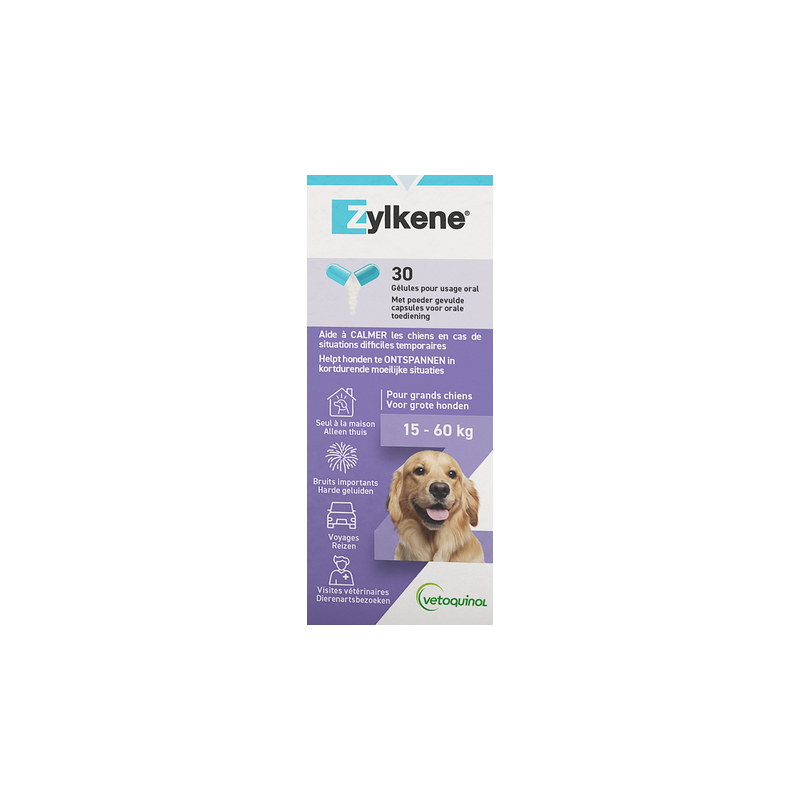 Zylkene kan u gebruiken bij honden die geconfronteerd worden met abnormale situaties of gebeurtenissen: een verhuizing, alleen thuis zijn, nieuwe mensen of dieren, reizen, vuurwerk,... Dit voedingssupplement zorgt voor een ontspannen gevoel zonder dat het dier suf wordt. Zo kunnen ze zich rustiger aanpassen aan nieuwe situaties en zal het leerproces vlotter verlopen.