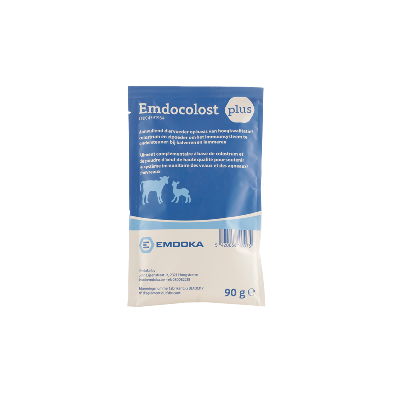 Emdocolost plus 90gram zakje is een aanvullend diervoeder op basis van hoogkwalitatief colostrum en eipoeder om het immuunsysteem te ondersteunen van kalveren en lammeren.