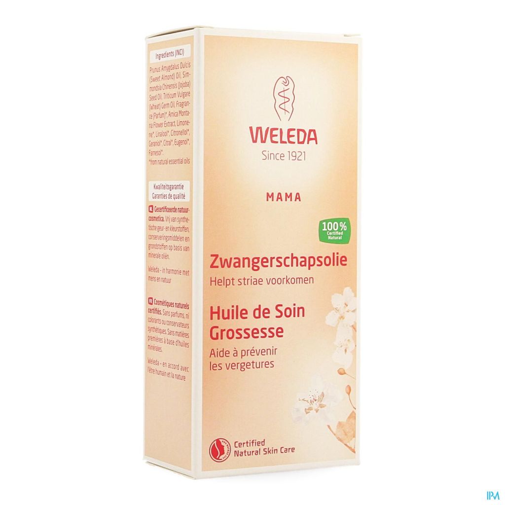 Door je huid soepel te houden en dagelijks in te smeren met Weleda Zwangerschapsolie kan je striemen helpen voorkomen. De combinatie van zoete amandelolie, tarwekiemolie en biologische jojoba-olie voedt de huid intensief, reguleert het vochtgehalte en ondersteunt het herstellend vermogen van de huid. Arnica-extract bevordert de doorbloeding van de huid en verbetert de elasticiteit van het huidweefsel waardoor haar spankracht verbetert. Pure etherische oliën van o.a. lavendel, wilde roos en sinaasappelbloesem zorgen voor een subtiele geur en brengen tot rust.