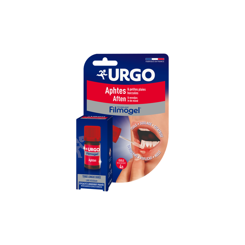 URGO Filmogel® Aften en mondwondjes verlicht de pijn snel en duurzaam. Het is een pijnwerend schild dat de wond beschermt tegen externe invloeden (voeding, tanden, beugel enz.) en voor een betere genezing van de aften zorgt.