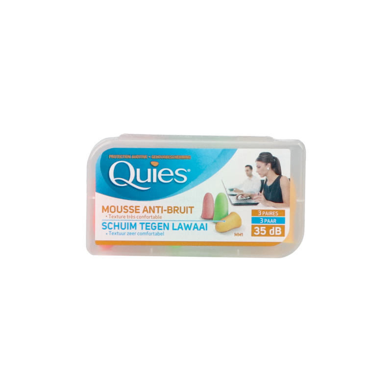 Met de gehoorbescherming uit schuim van Quies kunt u sterke geluiden met gemiddeld 35 dB verzwakken, zonder dat u volledig van de buitenwereld afgesloten bent. De anatomische vorm ervan past zich aan de gehoorgang aan zodat de bescherming perfect in het oor blijft zitten.