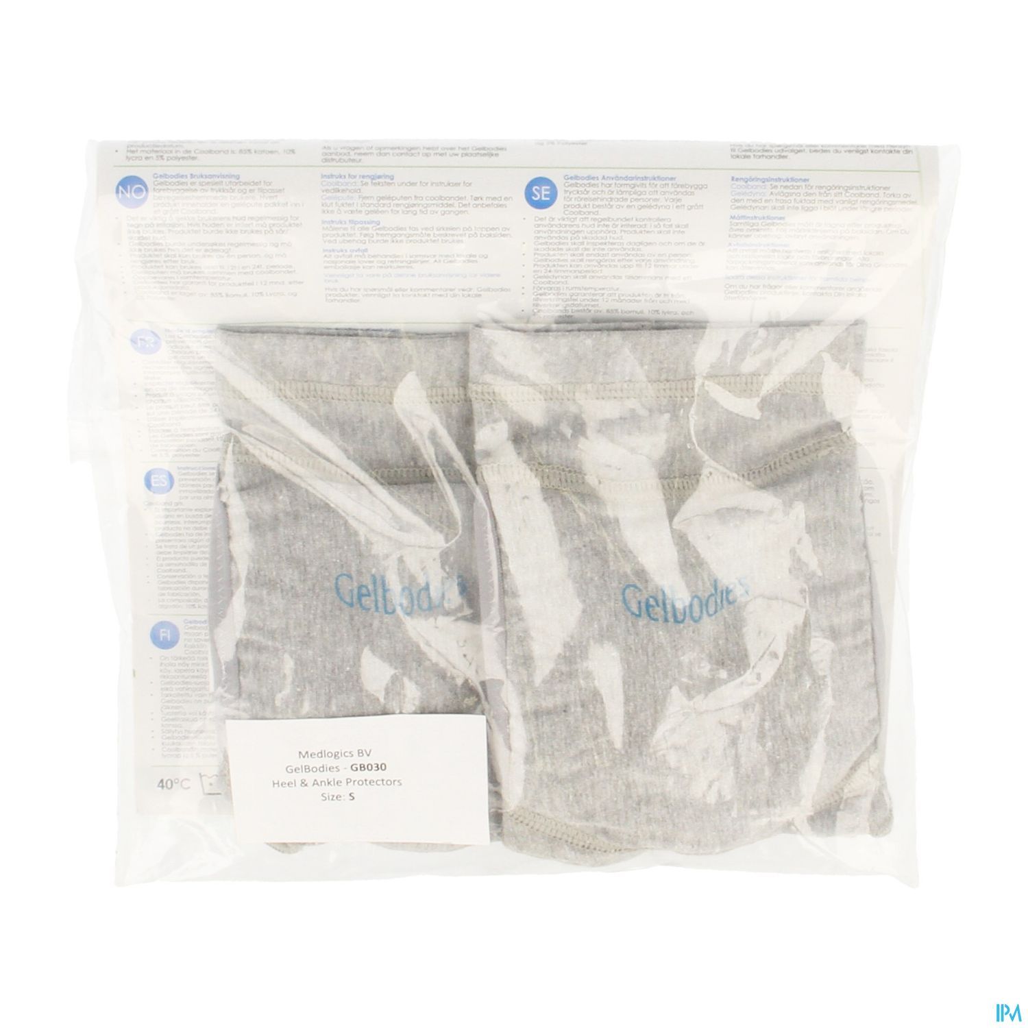 Comfortabele en lichtgewicht: hiel- en enkelbeschermers, voorzien van een silicone gelkussen in een ademende stretch Coolband. De speciale vorm van de gel beschermt tevens de enkels aan de beide zijkanten, hetgeen nuttig is bij zijlig. GelBodies™ zijn ontwikkeld voor langdurig gebruik, nochtans raadt men aan ze niet langer te dragen dan 12 van de 24 u per dag. Verkrijgbaar in 3 groottes. Voor de maatname meet men de omtrek van de enkel net boven de enkelknobbel. Bij twijfel neemt men de grotere maat. De Coolband wordt gewassen op 40°C. Voor het reinigen van de gel verwijdert men de Coolband en maakt men de gel schoon met een vochtige doek en een gewoon huishoudelijk reinigingsproduct. Het is niet aan te raden om de gel te weken. De silicone gel mag in geen geval in de wasmachine of de droogkast.