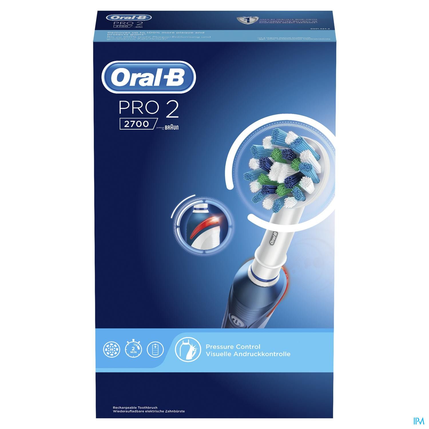 Ervaar de Oral-B PRO 2 van het nummer één meest gebruikte tandenborstelmerk door tandartsen wereldwijd. De PRO 2000 elektrische tandenborstel helpt je 2 minuten te poetsen zoals aanbevolen door je tandarts. De professionele timer geeft elke 30 seconden aan dat je een andere zone moet poetsen. Jij beweegt de borstel gewoon in je mond en de unieke, ronde kop van Oral-B doet de rest. Hij verwijdert tot 100% meer tandplak dan een gewone manuele tandenborstel voor gezonder tandvlees en maakt je glimlach witter vanaf de eerste poetsdag door oppervlakkige verkleuringen te verwijderen. Bovendien helpt de tandenborstel je delicate tandvlees beschermen met zijn drukcontroletechnologie die de poetssnelheid vermindert en je waarschuwt als je te hard poetst. De Oral-B PRO 2 2700 tandenborstel met zijn poetsdruksensor is onmisbaar voor iedereen die naar een elektrische tandenborstel wil overschakelen en zijn mondgezondheid wil verbeteren. Geen wonder dat Oral-B het meest gebruikte elektrische tandenborstelmerk door tandartsen wereldwijd is.