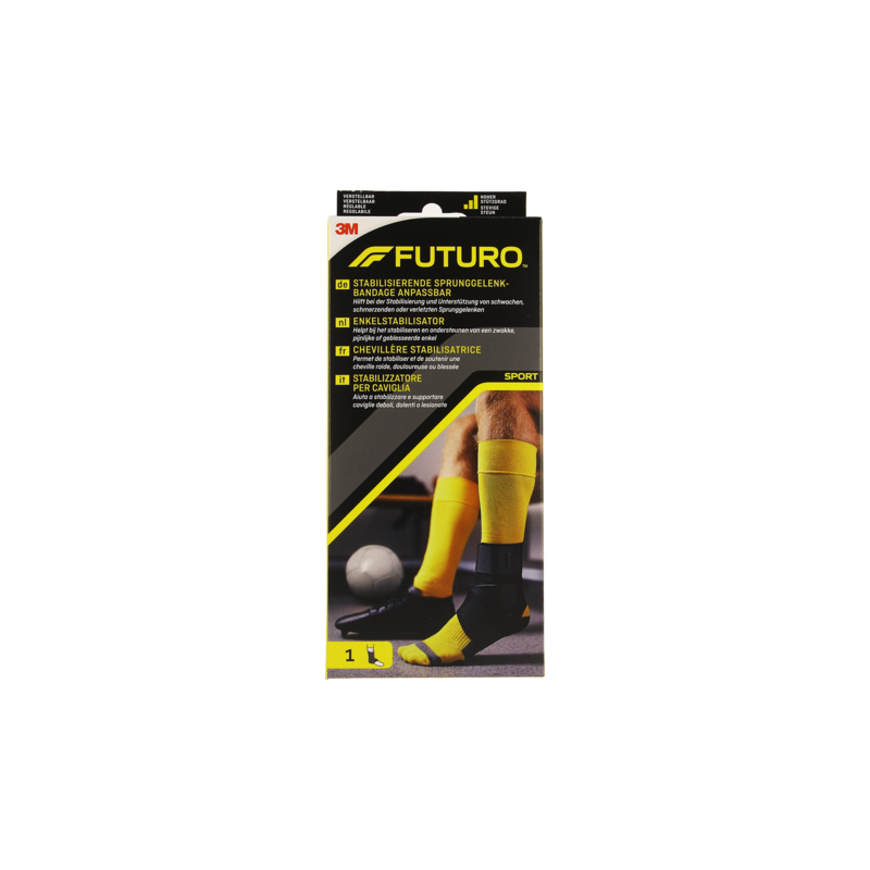 Soms hebt u alleen een beetje steun nodig om te blijven meedoen. De FUTURO™ Enkelstabilisator heeft stevige zijstabilisatoren en biedt de steun en stabiliteit die u nodig hebt om op het veld en in de sportschool te blijven presteren. De verstelbare banden zorgen voor een perfecte pasvorm en de ademende materialen zijn luchtdoorlatend. Vertrouw op de steun van de FUTURO™ Enkelstabilisator terwijl u doet wat u graag doet.