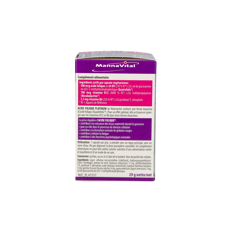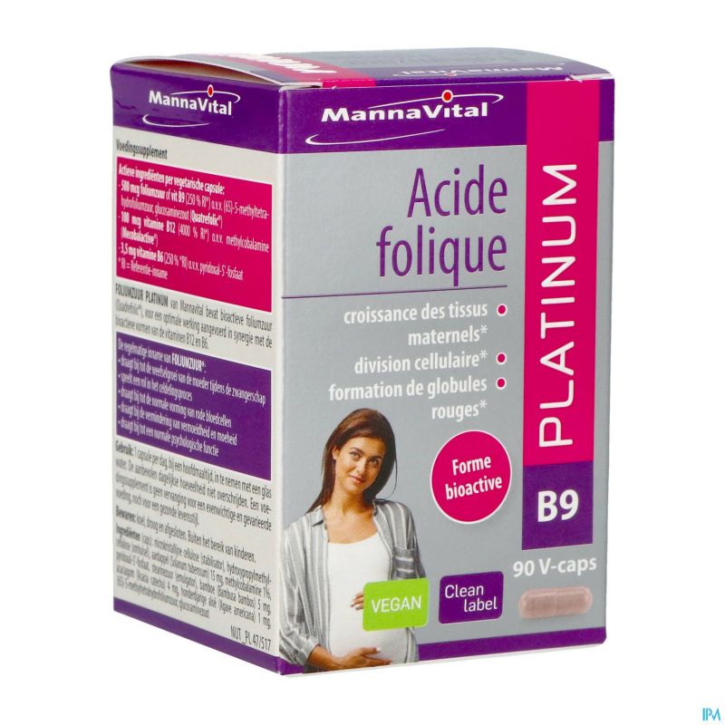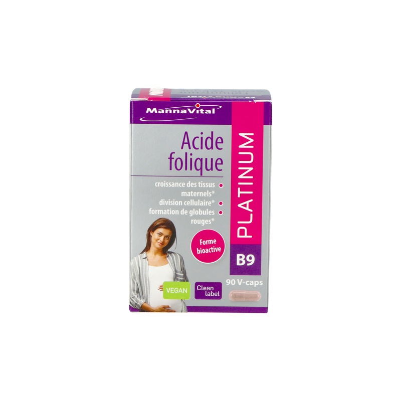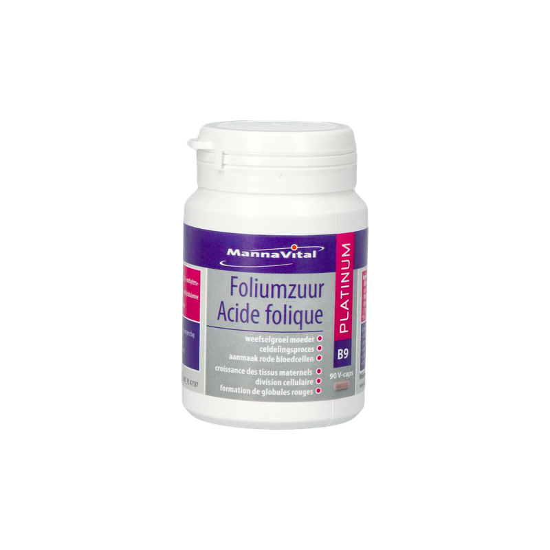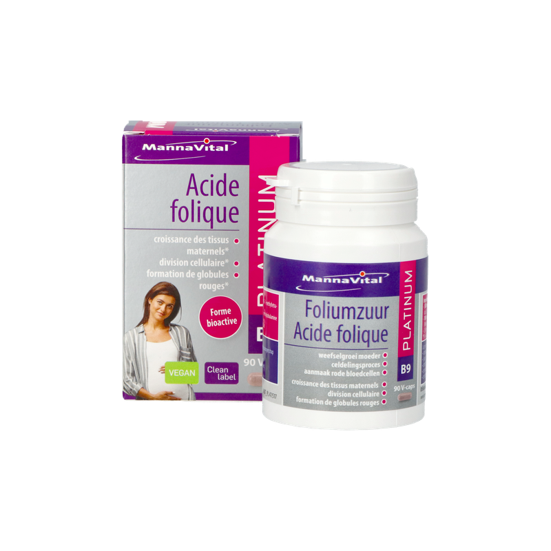 Voor een normaal verloop van de intensieve celdelingen en de daaraan verbonden weefselgroei die tijdens de zwangerschap plaatsgrijpt, is het B-vitamine foliumzuur onmisbaar. De bioactieve vorm van foliumzuur, die zeer goed wordt opgenomen, is 5-methyltetrahydrofoliumzuur. Dat is dan ook de hoofdingrediënt van FOLIUMZUUR PLATINUM van Mannavital. Omdat foliumzuur op veel vlakken in synergie samenwerkt met de vitamines B6 en B12, zijn ook deze vitaminen – alweer in hun correcte, bioactieve vormen – eveneens opgenomen in de formule van FOLIUMZUUR PLATINUM. Dat komt ook de aanmaak van rode bloedcellen, het energiepeil, een normale werking van het zenuwstelsel en een normale homocysteïnespiegel ten goede, ook voor niet-zwangere vrouwen en voor mannen.