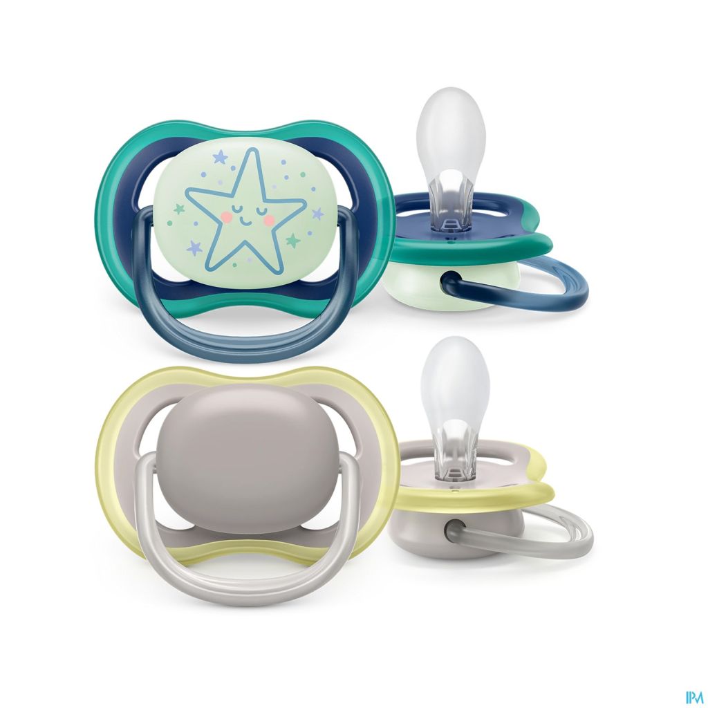 Fopspeen met het comfort van lucht. De Philips Avent Ultra Air-speen heeft extra grote luchtopeningen om de huid van je baby droog te houden. Een van de twee fopspenen heeft een knop die oplicht in het donker, zodat je die kunt zien wanneer het licht uit is.