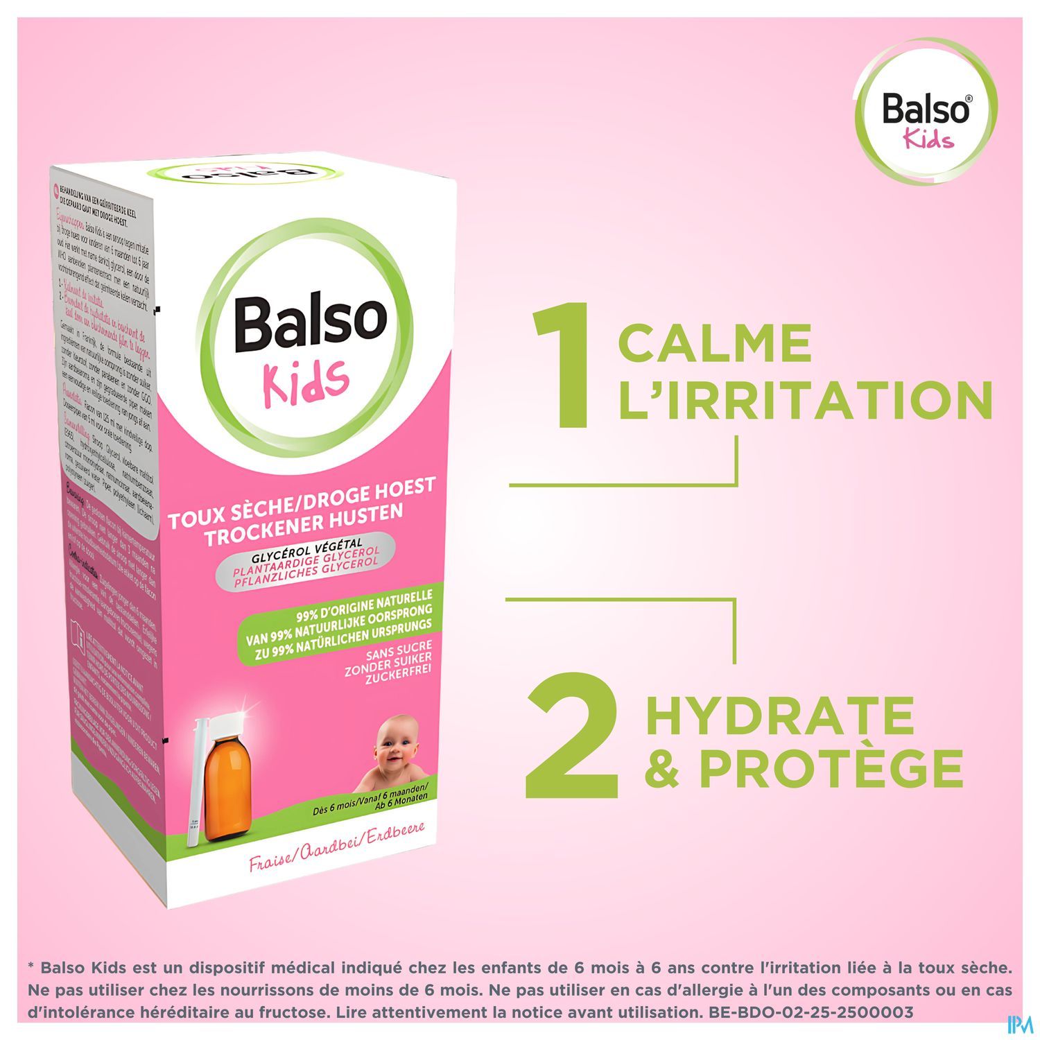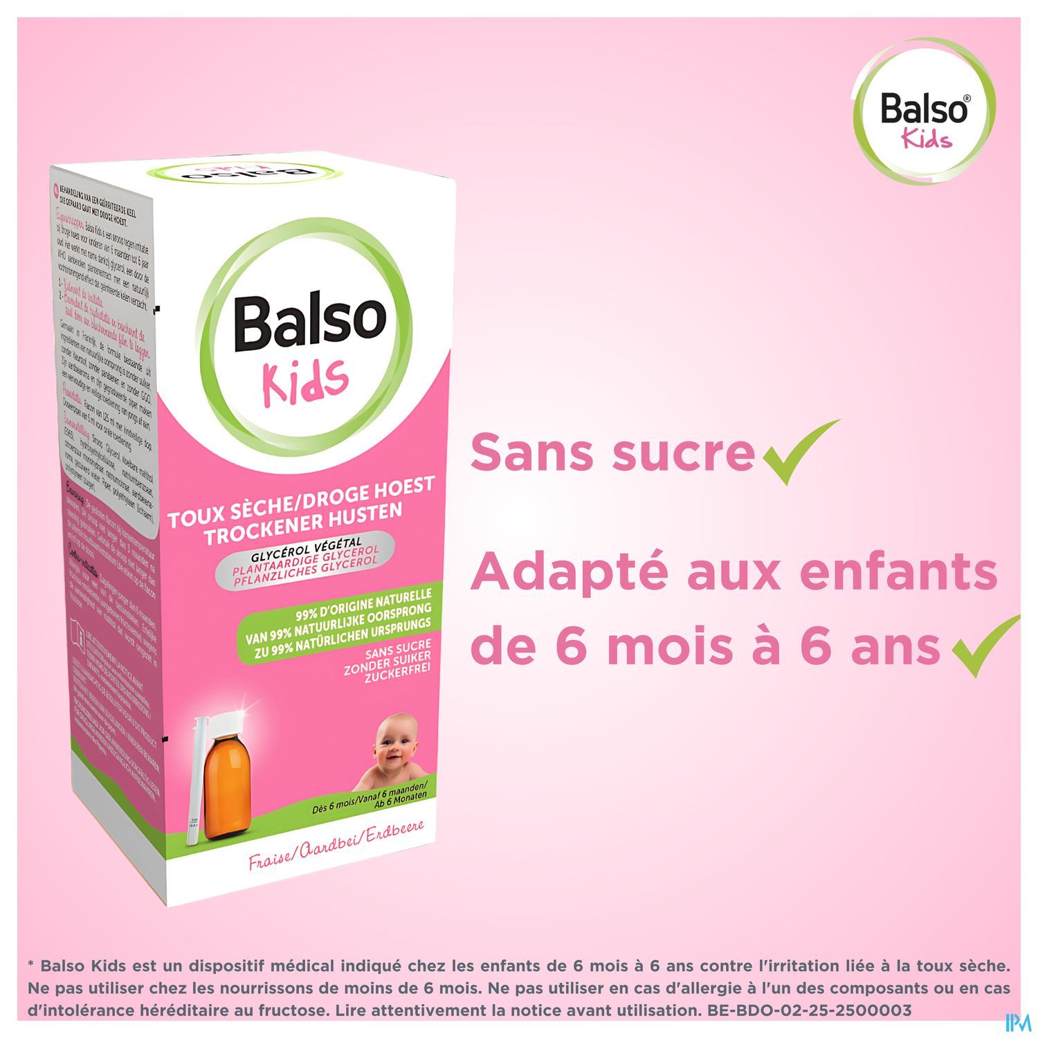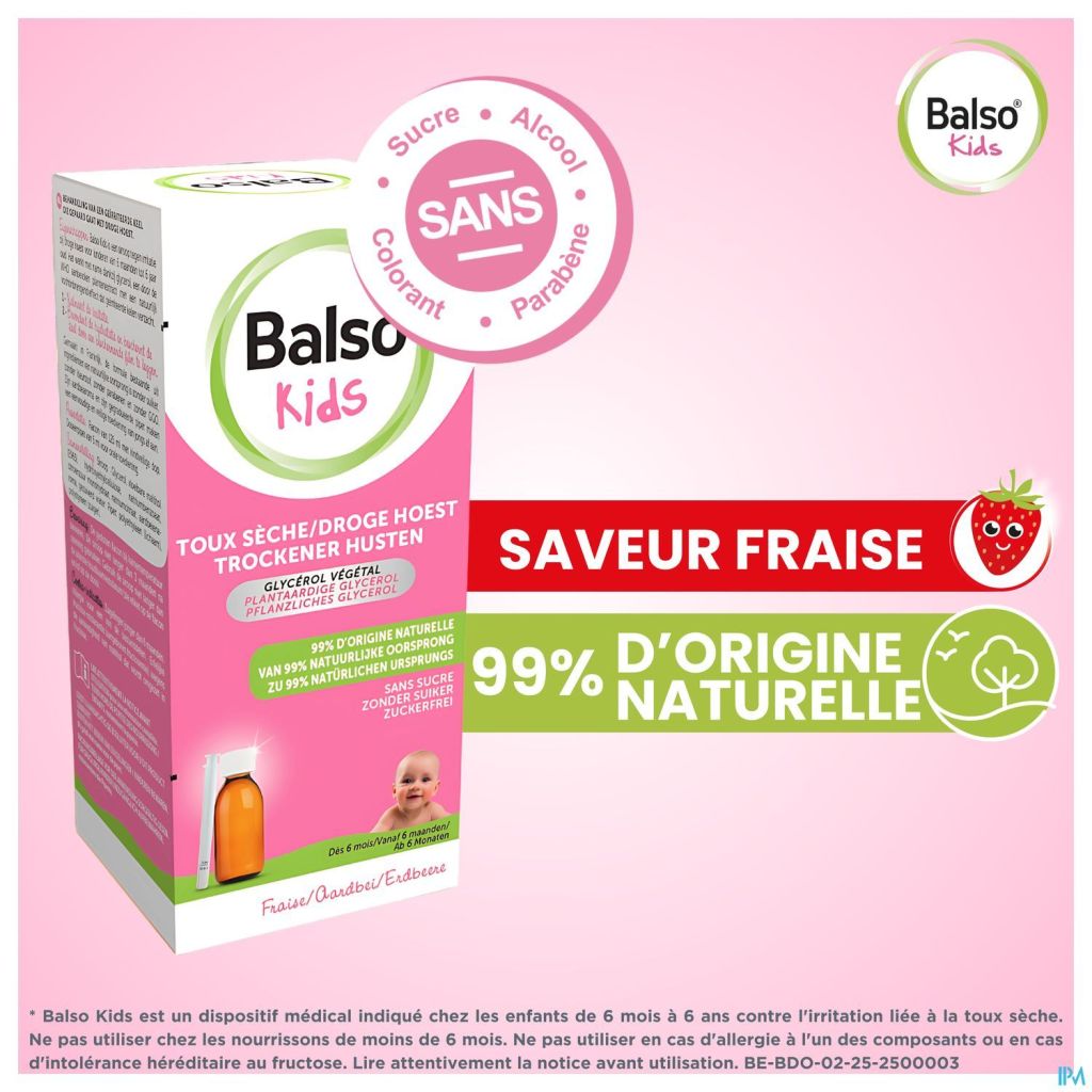 Balso kids is een siroop voor kinderen van 6 maanden tot 6 jaar oud tegen irritatie als gevolg van droge hoest, veroorzaakt door virale winderinfecties die rhinofaryngitis en verkoudheid veroorzaken en door bepaalde externe agressies zoals de aanwezigheid van sigarettenrook, vervuiling, stof...