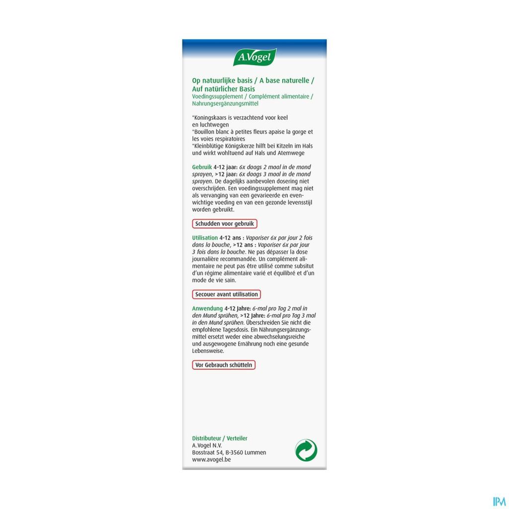A.Vogel Spray kriebel in de keel is een 100% natuurlijk voedingssupplement met plantenextracten van heemst en koningskaars. Deze spray vormt een verzachtend laagje in de keel bij een kriebelend gevoel en ondersteunt het behoud van een comfortabele keel. Dankzij het handige formaat neem je hem overal makkelijk mee naartoe – ideaal voor onderweg of op het werk.