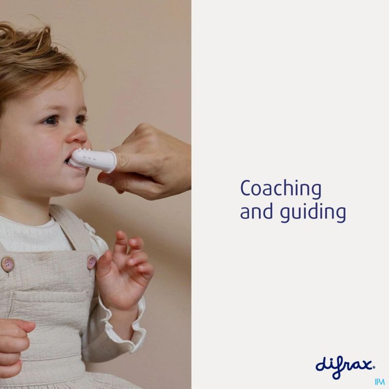 Kindertandartsen adviseren met tandenpoetsen te beginnen, zodra de eerste tandjes doorkomen. Met de Difrax vingertop tandenborstel maken kindjes spelenderwijs kennis met tandenpoetsen. In het begin kan het tandenpoetsen van die eerste paar doorgekomen tandjes met een gewone tandenborstel best lastig zijn. In plaats daarvan kun je ook de vingertop tandenborstel gebruiken. Difrax helpt een handje door de toevoeging van massagebolletjes aan de achterkant van de vingertop tandenborstel. Massage kan de pijn bij doorkomende tandjes verlichten. De zachte tandenborstel is veilig in gebruik en biedt een goede start van de mondverzorging.