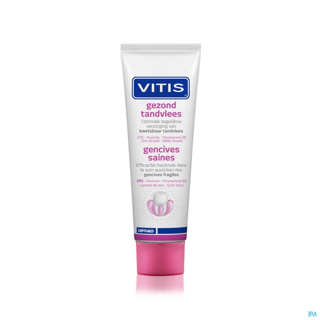 VITIS Gezond Tandvlees Tandpasta geeft een optimale dagelijkse ondersteuning van de mondhygiëne bij kwetsbaar tandvlees. De tandpasta en mondspoelmiddel gaat effectief tandplaquevorming tegen en verzorgt en versterkt het tandvlees. VITIS Gezond Tandvlees wordt ook aanbevolen wanneer het tandvlees extra gevoelig is, bijvoorbeeld na een behandeling van (ernstige) tandvleesbehandelingen en bij een lage weerstand, zwangerschap, langdurige stress of ziekte.