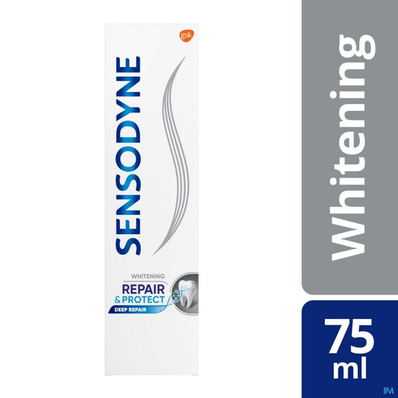 Sensodyne Repair & Protect Whitening dagelijkse tandpasta helpt de kwetsbare plekken van de tand te herstellen en te beschermen. Het is klinisch bewezen dat de unieke NovaMin formule verlichting geeft bij pijnlijke gevoeligheid. Sensodyne Repair & Protect Whitening dagelijkse tandpasta bevat fluoride om de tanden te helpen versterken. De vernieuwde Sensodyne Repair & Protect Whitening dagelijke tandpasta vormt een harde laag op de kwetsbare plekken van de gevoelige tanden om te helpen bij herstel. Daarnaast helpt Sensodyne Repair & Protect Whitening de natuurlijke witheid van je tanden te herstellen. Gevoeligheid kan een indicatie zijn dat je tanden kwetsbaar zijn, omdat tandbeen bloot komt te liggen als gevolg van glazuurverlies of terugtrekkend tandvlees. Indien blootgesteld tandbeen in contact komt met hete, koude, zoete of zure etenswaren of dranken, of zelfs een tandenborstel, kan de onderliggende zenuw een scherpe prikkel afgeven. Tandbeen dat beschermd wordt door tandglazuur of tandvlees, kan bloot komen te liggen door te hard poetsen, tandenknarsen en/of tanderosie. Gebruik Sensodyne Repair & Protect Whitening als dagelijkse tandpasta: Unieke NovaMin formule zorgt voor krachtiger herstel* & Helpt de natuurlijke witheid van je tanden te herstellen. Dit is een medisch hulpmiddel. Lees voor gebruik de gebruiksaanwijzing. *Vormt een beschermende laag op de kwetsbare plekken van de gevoelige tanden bij tweemaal daags poetsen.