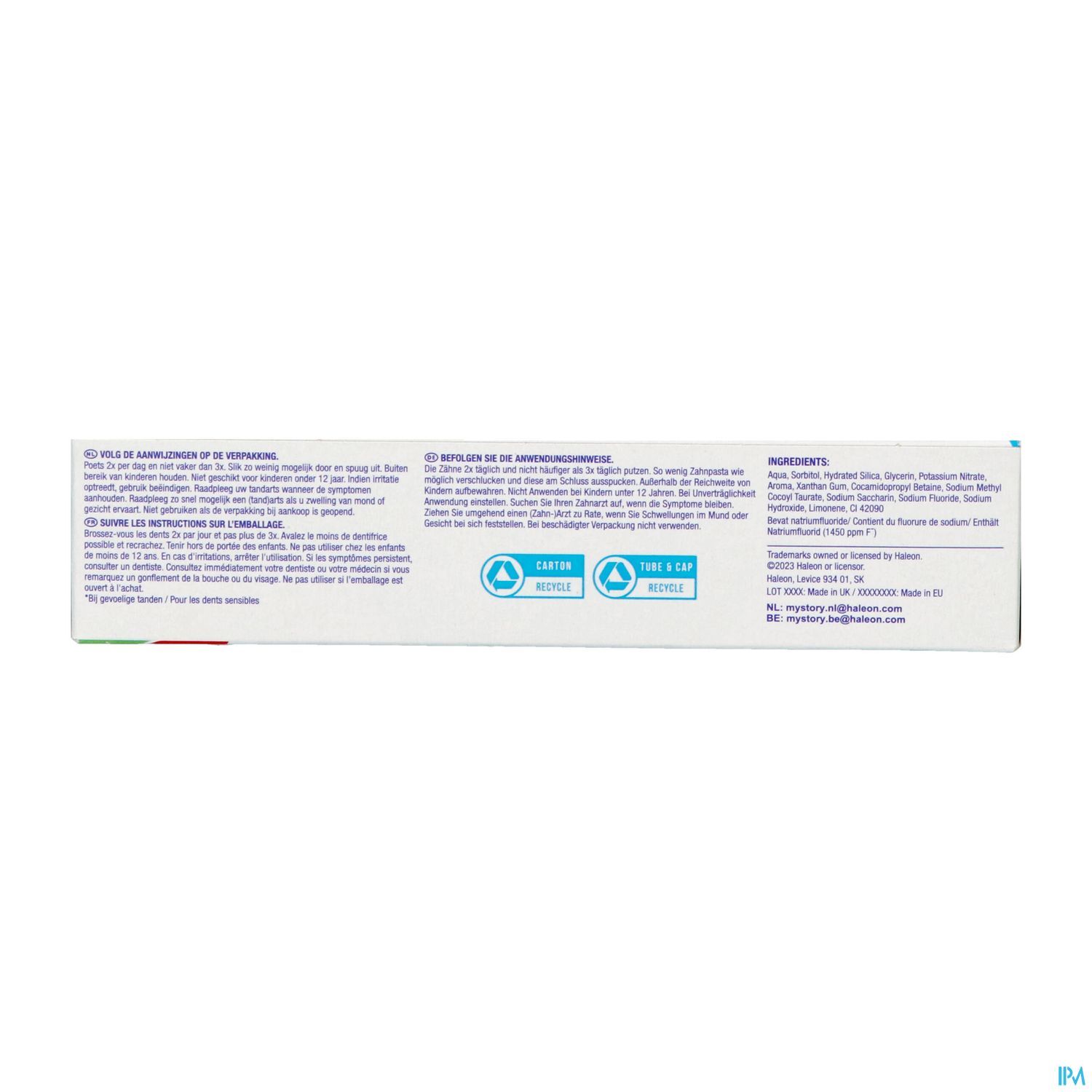 Aqua, Sorbitol, Hydrated Silica, Glycerin, Potassium Nitrate, Aroma, Xanthan Gum, Cocamidopropyl Betaine, Sodium Methyl Cocoyl Taurate, Sodium Saccharin, Sodium Fluoride, Sodium Hydroxide, Limonene, CI 42090