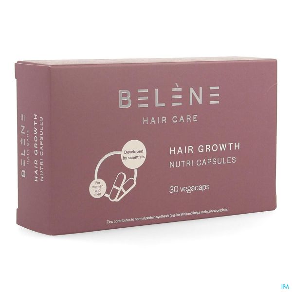 Belène® Hair Growth Nutri Capsules voor het behoud van sterk haar, werden samengesteld door wetenschappers en bevatten natuurlijke ingrediënten die het haar van binnenuit versterken. Belène® Hair Growth Nutri Capsules bevat het Nutri V Complex* dat bijdraagt aan gezonde haarcellen en haargroei1 en de normale pigmentatie2 van het haar behoudt: • 250 mg keratinepeptiden van natuurlijke oorsprong • 75 mg Vitis vinifera5 • Mineralen- en vitaminencomplex met: zink1, koper2, vitamine B3, B5, B63 en biotine4.