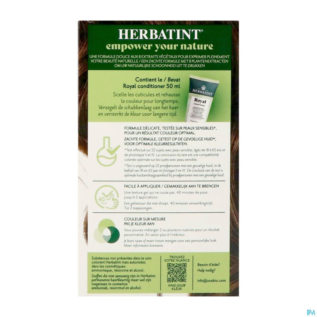 Herbatint is een permanente haarkleuringsgel zonder ammoniak, verrijkt met 8 organische kruidenextracten. Herbatint geeft het haar een zeer natuurlijke en intense kleur en dekt uw grijze haar voor 100% vanaf de eerste toepassing. Uw haar krijgt een heldere en levendige kleur en is direct gezonder en natuurlijk mooi.