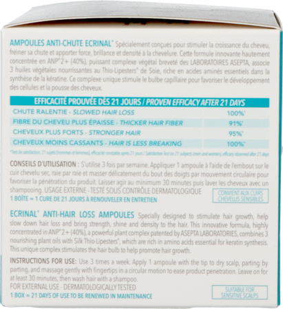 Breng 3 keer per week 1 ampul aan op de droge hoofdhuid, haarscheiding per haarscheiding, en masseer zachtjes in. Minstens 30 minuten laten inwerken en vervolgens het haar wassen met een ECRINAL shampoo.