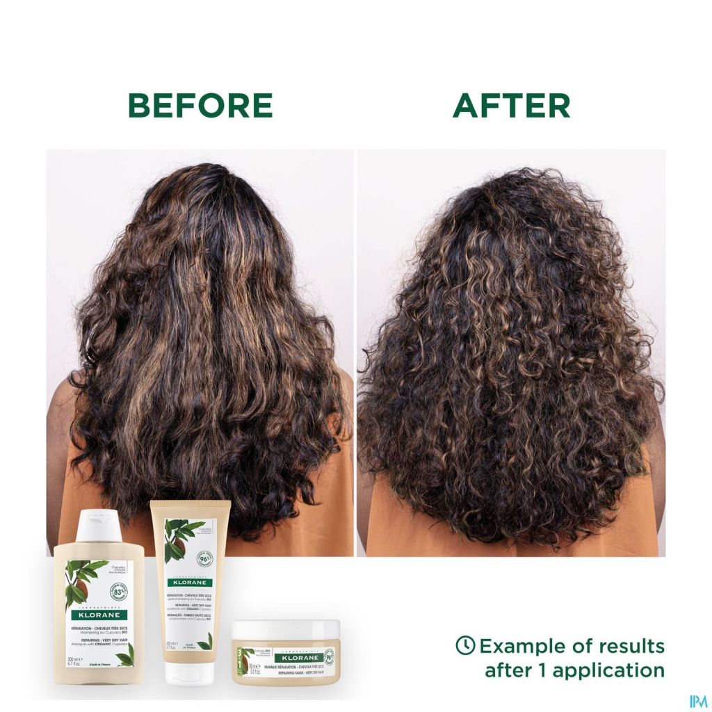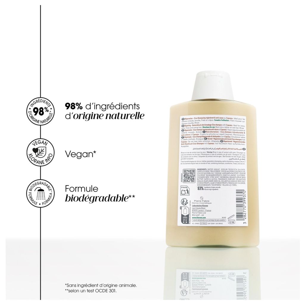 De Cica Regenererende en antibreuk shampoo van Klorane wast, voedt en herstelt zeer droog, beschadigd haar vanaf het eerste gebruik*. Ideaal voor golvend, krullend of kroezend haar. De dichte textuur met een opbeurende geur trekt snel in en spoelt snel af, zonder het haar te verzwaren. Het haar is sterker, soepeler, glanzend en gemakkelijker in model te brengen. De formule, die voor 83% uit natuurlijke ingrediënten bestaat, verzorgt uw haar.
