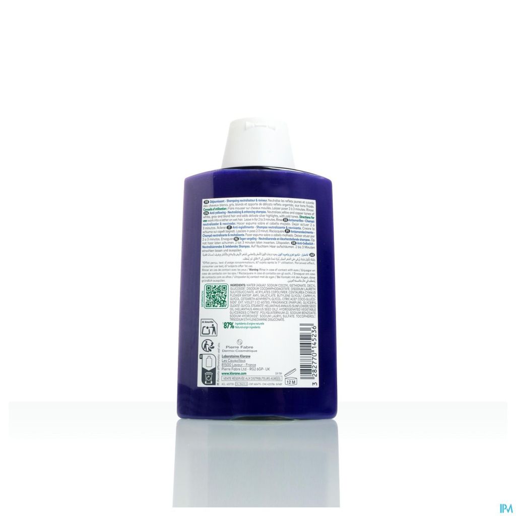 De formule van Klorane Anti-Yellowing neutraliserende en revitaliserende shampoo omhult het haar met subtiele koele tinten. Het is geformuleerd met zachte reinigende en texturiserende ingrediënten die een zeer aangename zintuiglijke ervaring bieden. Deze combinatie van fijn uitgebalanceerde ingrediënten geeft blond haar en grijs haar al hun levendigheid terug. Het haar is soepel en gemakkelijk te stylen en onthult zijn natuurlijke pracht en glans.