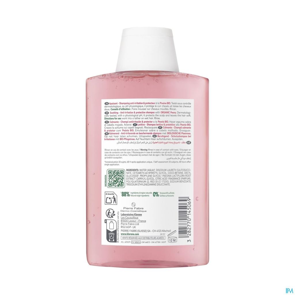 Met de Kalmerende anti-irriterende en beschermende shampoo met Biologische medicinale Pioenroos biedt Klorane de gevoelige hoofdhuid onmiddellijk* en 48 uur lang** verlichting, terwijl het evenwicht van de hoofdhuid wordt gerespecteerd. De biologisch afbreekbare*** en vegan**** formule van deze shampoo bestaat voor 88% uit ingrediënten van natuurlijke oorsprong. De kracht van de formule schuilt in het extract van Biologische Chinese Pioenroos, een bloem die geteeld wordt in een beschermd ecosysteem en van oudsher gebruikt wordt voor haar kalmerende eigenschappen. De formule met fysiologische pH reinigt de hoofdhuid in alle zachtheid, biedt langdurige bescherming en verzacht jeuk en irritatie onmiddellijk. Het haar is zacht en heerlijk geparfumeerd met een subtiele, kalmerende geur. Dit alles in een recycleerbare verpakking die voor minstens 78% uit gerecycleerd materiaal bestaat. Een doeltreffende shampoo om de gevoelige hoofdhuid te kalmeren.