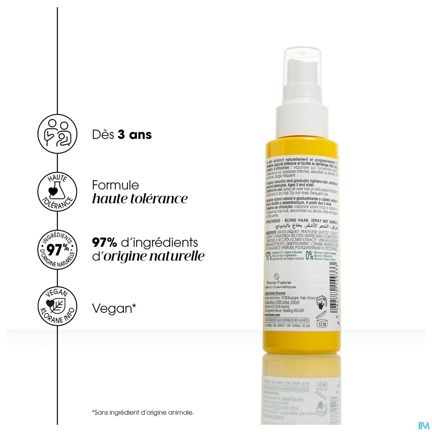 De Laboratoires Klorane hebben een natuurlijk verzorgingsproduct ontwikkeld dat blond haar geleidelijk aan lichter en zachter maakt. De spray met Kamille bestaat voor 97 % uit natuurlijke ingrediënten en heeft een drievoudige werking: hij verlicht het haar in alle zachtheid en op natuurlijke wijze, laat het glanzen en maakt het gemakkelijk doorkambaar. De spray is geschikt voor van nature blond haar, gekleurd haar of haar met een coupe soleil. De minimalistische formule is verrijkt met kamille en azijn. Omdat hij zeer goed verdraagbaar is, kunnen alle gezinsleden vanaf drie jaar deze spray gebruiken. Azijn maakt de haarschubben glad en zorgt voor nog meer glans, terwijl kamille het haar lichter maakt en beschermt tegen uitdrogen. Gebruik deze spray op nat of droog haar. Hij maakt het haar zijdezacht en dompelt het onder in een bad van licht. Uw haar zag er nog nooit zo stralend uit. Naargelang van het gebruik zorgt de spray voor drie verlichtende effecten: een volledig blonde look, gehighlighte lokken of een 'tie-dye'-effect op lange lokken.