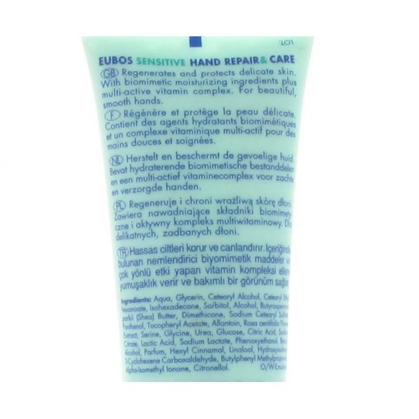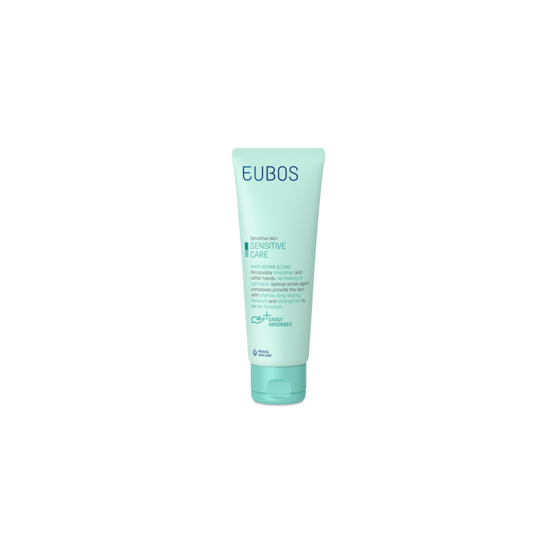 De speciale formule voor zachte en gladde handen regeneert en beschermt de natuurlijke biosfeer van de huid. Droge, ruwe handen worden weer zichtbaar zacht en soepel. De actieve werkstoffen beschermen tegen schadelijke invloeden van buitenaf en voorkomen een droge en ruwe huid. Een dagelijkse verzorging van uw handen met Eubos Sensitive hand repair & care zorgt voor goed verzorgde, fluweelzachte handen.