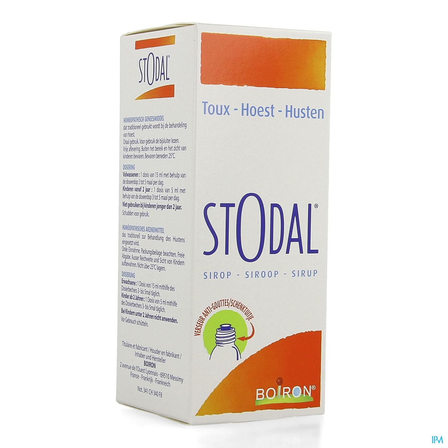 Stodal is een homeopathisch geneesmiddel dat wordt toegepast bij hoest. De werkzaamheid vandit homeopathisch middel is door het College ter Beoordeling van Geneesmiddelen niet metwetenschappelijke criteria beoordeeld.De stroop is verpakt in een doos met een fles van 200 ml.