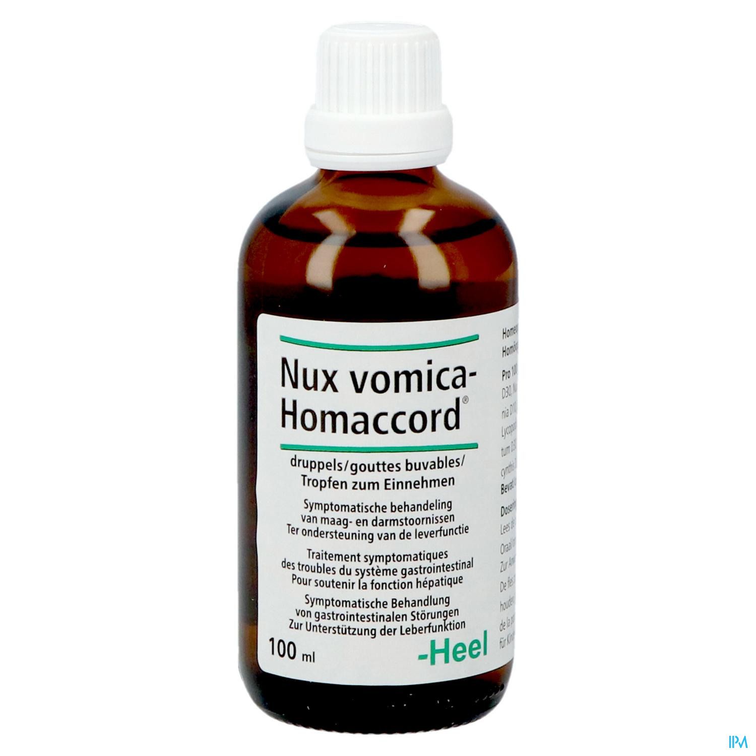 Nux vomica-Homaccord is een homeopathisch geneesmiddel met bestanddelen traditioneel gebruikt voor de behandeling van functionele stoornissen van de lever en het maagdarmkanaal, waaronder acute en chronische gastritis, maagzuur, indigestie, misselijkheid, constipatie, opgeblazen gevoel en diarree; ontgifting van de lever en het maagdarmkanaal zoals bijvoorbeeld na overdaad van alcohol, koffie of nicotine.