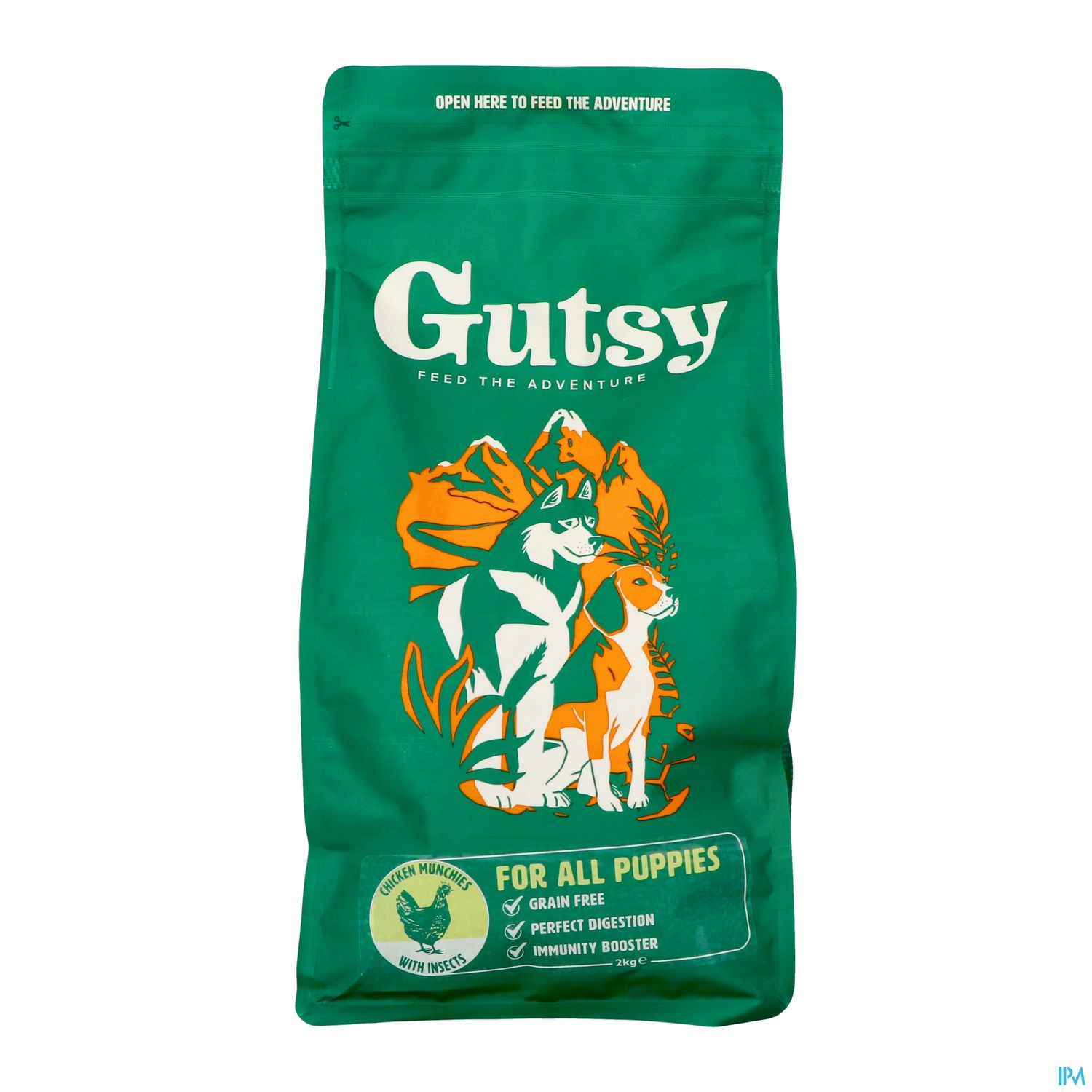 Gutsy Chicken Munchies voor puppies zijn graanvrij en ontworpen om de immuniteit te verhogen en de spijsvertering te verbeteren. Ze bestaan uit 85% dierlijke eiwitten, met insecten, zoete aardappel, wortel, appel, kip en veenbessen.