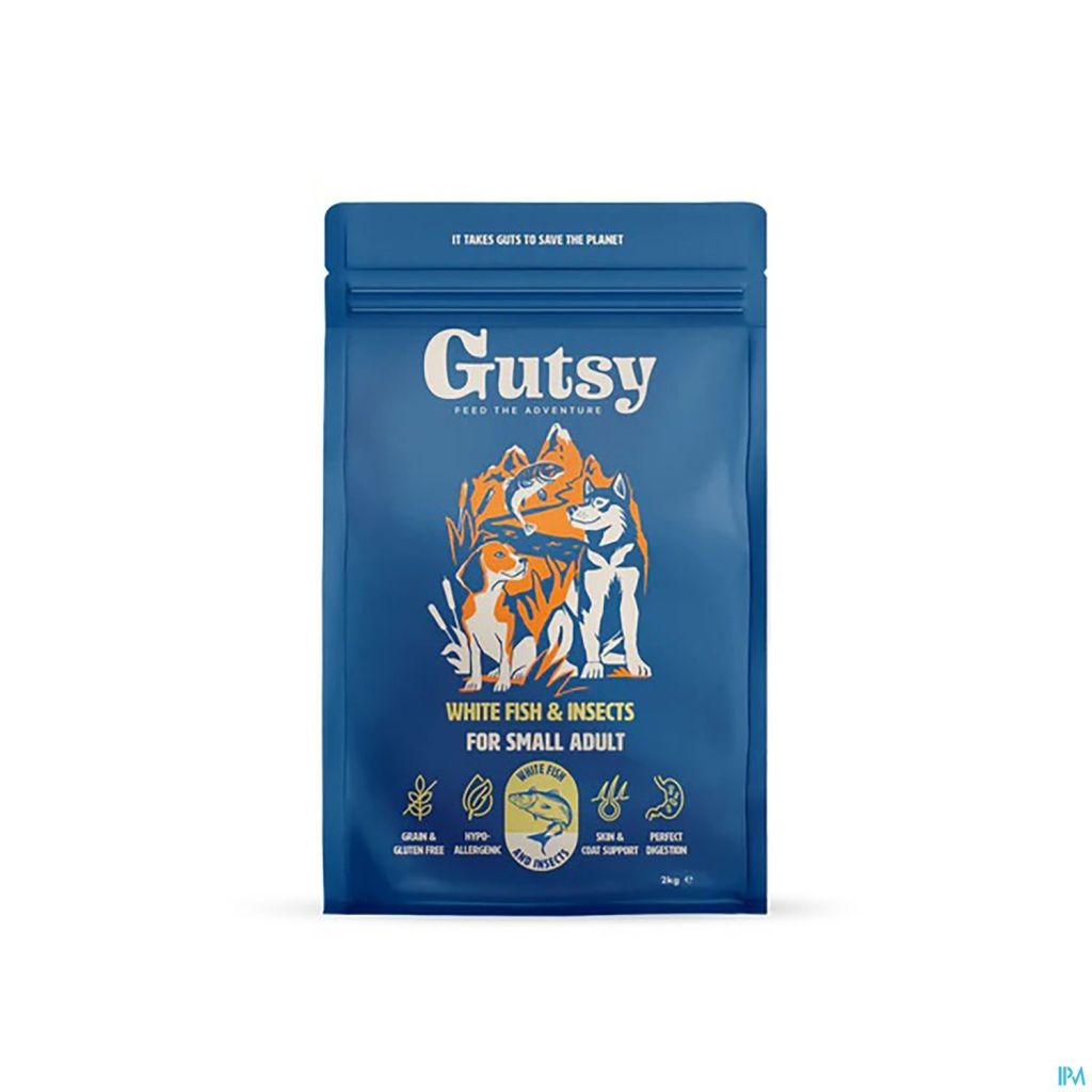 Gutsy Witte Vis & Insect voor kleine volwassen honden zijn hypoallergene brokjes, volledig vrij van granen en gluten. Met liefde gemaakt voor gevoelige eters.