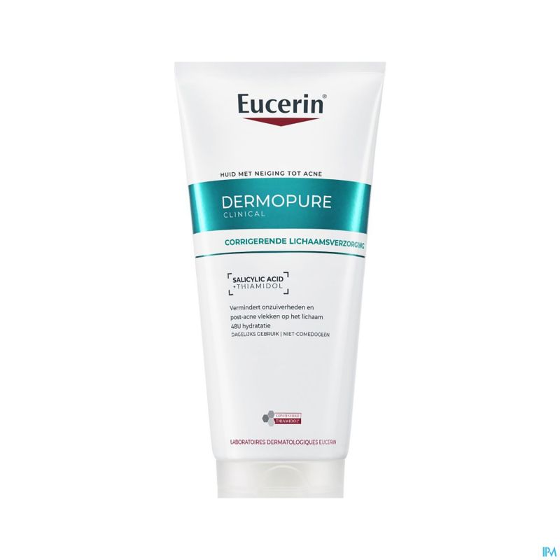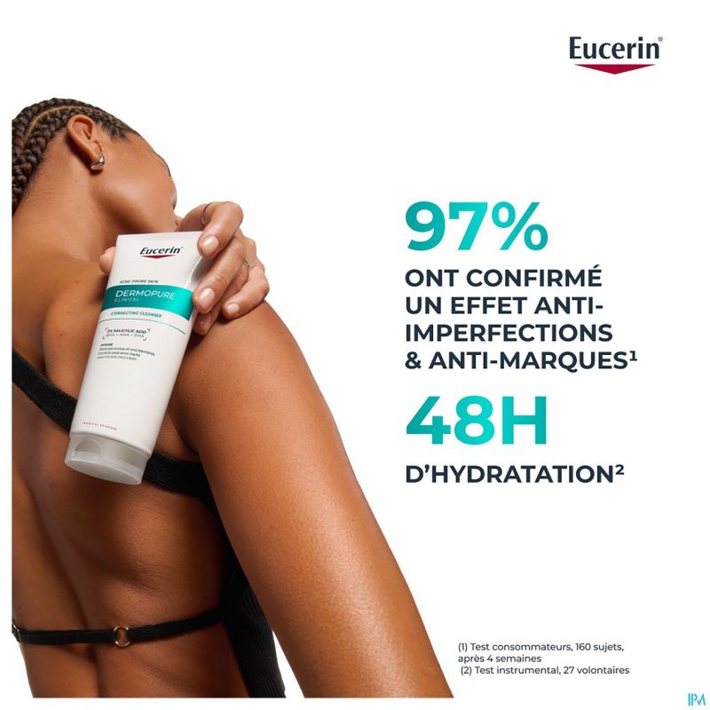 Eucerin DERMOPURE CLINICAL Corrigerende Lichaamsverzorging is klinisch en dermatologisch getest. Dit product hydrateert gedurende 48 uur (1) en corrigeert onzuiverheden en post-acne vlekken vanaf twee weken (2).