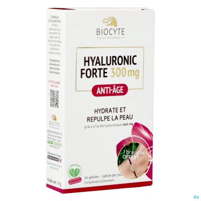 Biocyte HYALURONIC FORTE 300MG is een voedingssupplement met een wetenschappelijk bewezen anti-rimpel en hydraterende werking op de huid. De vele agressieve invloeden van buitenaf waaraan onze huid wordt blootgesteld, bevorderen vroegtijdige veroudering, uitdroging van de huid en de vorming van rimpels. HYALURONIC FORTE 300MG hydrateert de huid en verbetert haar elasticiteit voor een snelle anti-ageing werking.