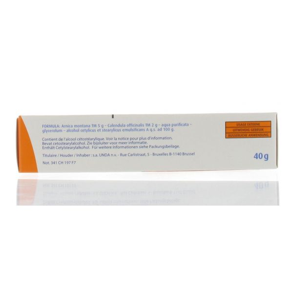 Arnica montana U.E. T.M. 5g – Calendula officinalis T.M. 2g. – Excip. (aqua purificata, glycerolum, alcohol cetylicus et stearylicus emulsificans A) q.s. ad 100g.
