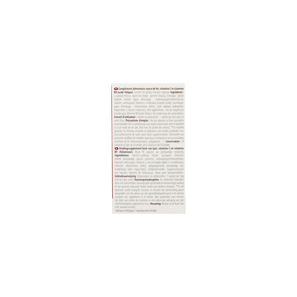 Ingrediënten: IJzer(II)-L-pidolaat, Vulstof: acaciagom, Omhulsel: violette plantaardige capsule (omhulsel: hydroxypropylmethylcellulose, kleurstof: anthocyaan), Vitamine C met vertraagde afgifte (L-ascorbinezuur, omhulsel: ethylcellulose (E462), gehydrogeneerde plantaardige olie, middellange keten triglyceriden), Antiklontermiddel: magnesiumzouten van vetzuren, Vitamine B9 (foliumzuur).