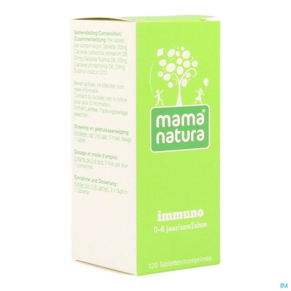 Per tablet (100 mg) bevat mama natura® immuno tabletten de werkzame bestanddelen: 20 mg Calcarea carbonica ostrearum D6, 20 mg Calcarea fluorica D6, 20 mg Calcarea phosphorica D6 en 20 mg Sulphur iodatum D12.