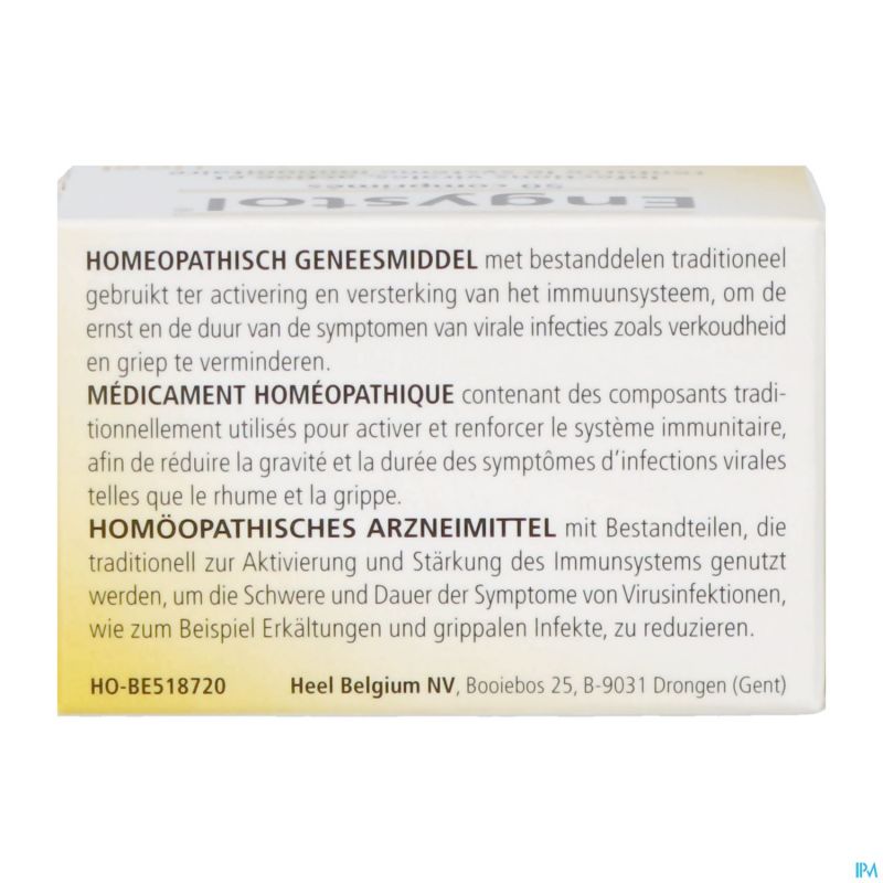Engystol is een homeopathisch geneesmiddel met bestanddelen traditioneel gebruikt ter activering en versterking van het immuunsysteem, om de ernst en de duur van de symptomen van virale infecties zoals verkoudheid en griep te verminderen. Dit homeopathische geneesmiddel wordt gebruikt volgens de principes van de bioregulerende geneeskunde. Wordt uw klacht na 7 dagen niet minder, of wordt hij zelfs erger, neem dan contact op met uw arts.