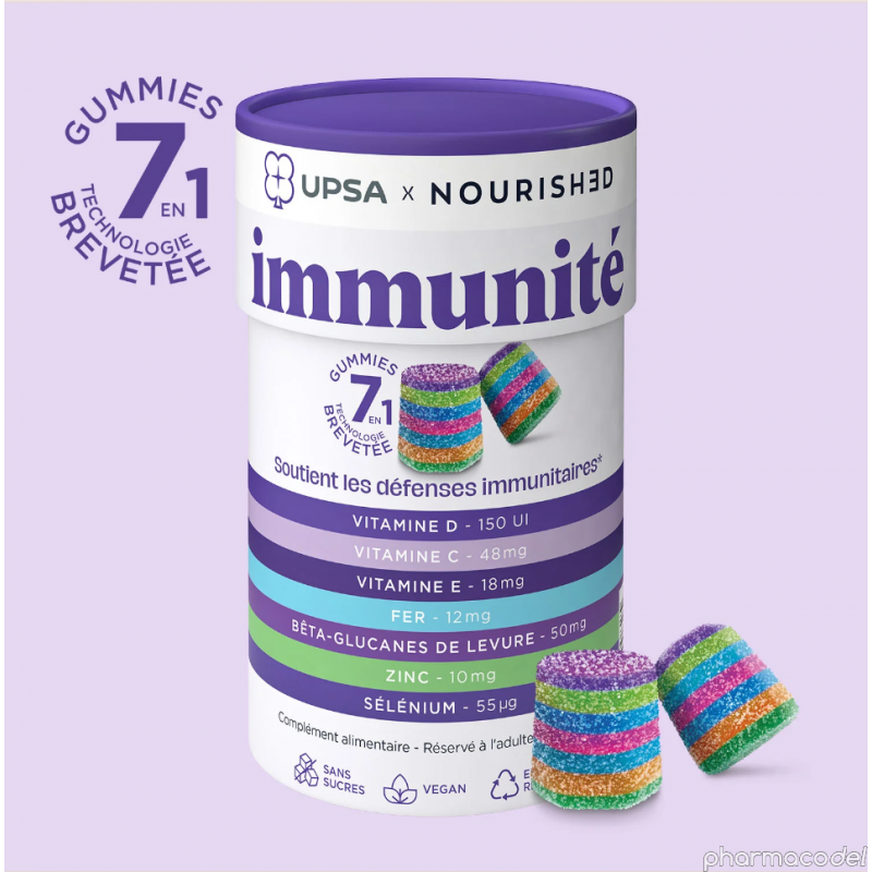 Rijk aan vitamines C, D, E, ijzer, zink en selenium, draagt onze UPSA x Nourished 7-in-1 Gummies Immunity bij aan: