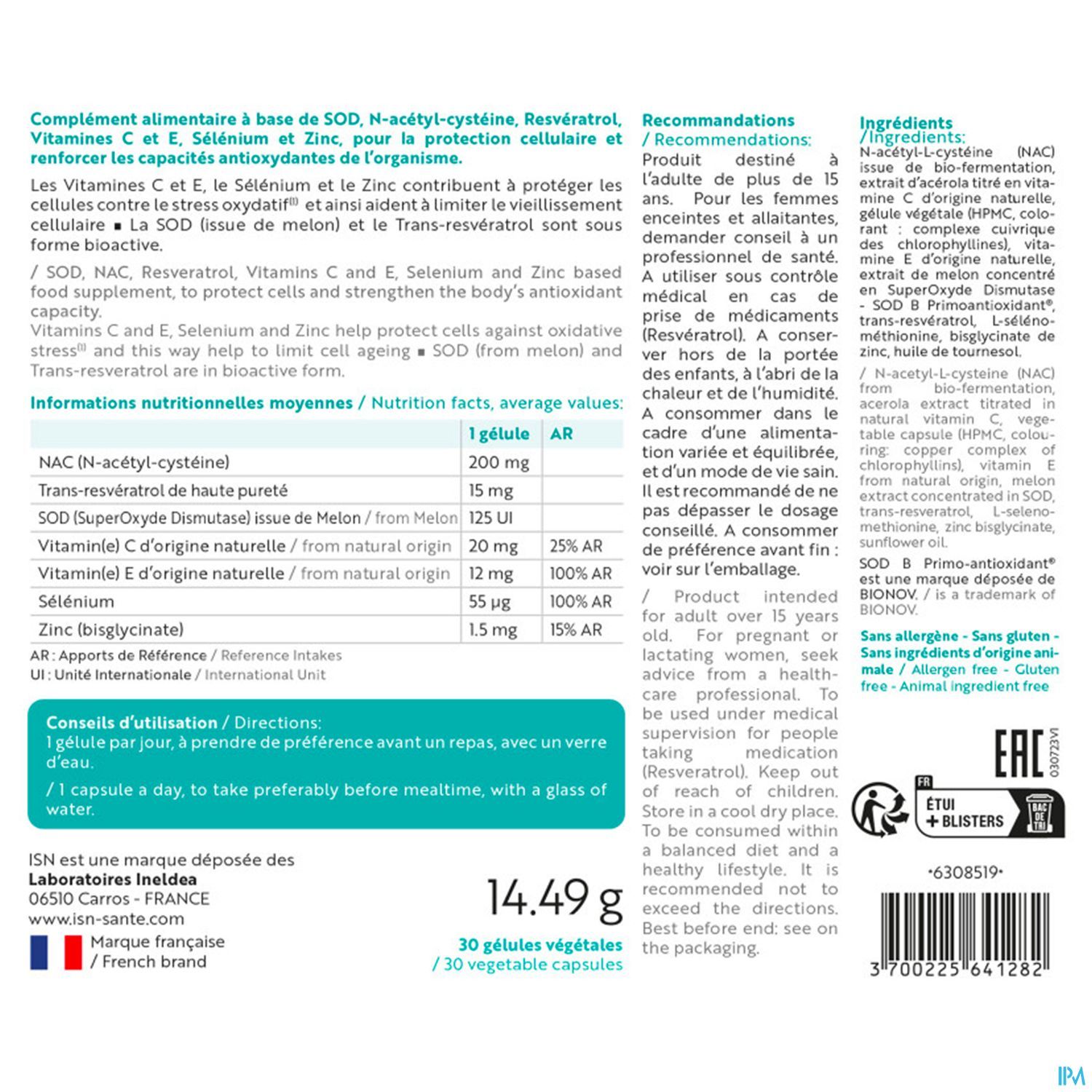 Ingrediënten: N-acetyl-L-cysteïne (NAC) uit biovergisting, acerola-extract met natuurlijk vitamine C-gehalte, plantaardige capsule (HPMC, kleurstof: koperchlorofylcomplex), natuurlijke vitamine E, meloenextract geconcentreerd in Superoxide Dismutase - SOD B PrimoantioxidantR, trans-resveratrol, L-selenomethionine, zinkbisglycinaat, zonnebloemolie.