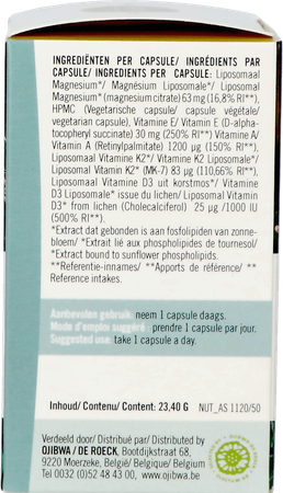Liposomaal Magnesium* (magnesium citraat), HPMC (Vegetarische capsule),