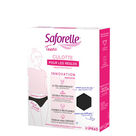 De Saforelle® Teens mensturatieslip heeft alles wat een klassieke slip te bieden heeft: hij is dun, discreet en comfortabel. Het pluspunt is de innovatieve textieltechnologie, verkregen door een superpositie van stoffen, die het mogelijk maakt om de stromen goed op te nemen en lekken te voorkomen.