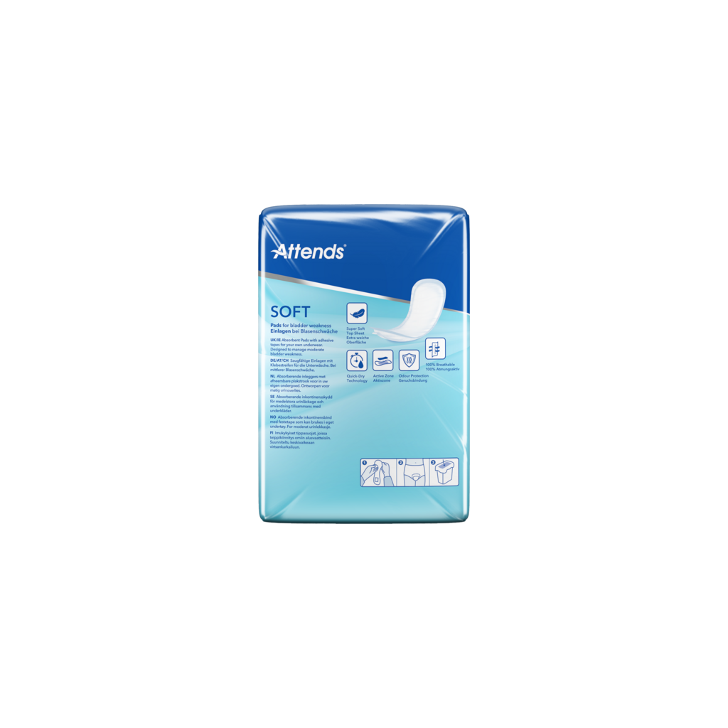 De inleggers hebben twee kleine fixatiestrips zodat de inlegger veilig op zijn plaats blijft in uw eigen ondergoed om risico op lekkage uit te sluiten. Alle Attends Soft inleggers hebben een zachte, luchtdoorlatende buitenlaag die de conditie van de huid gezond houdt.