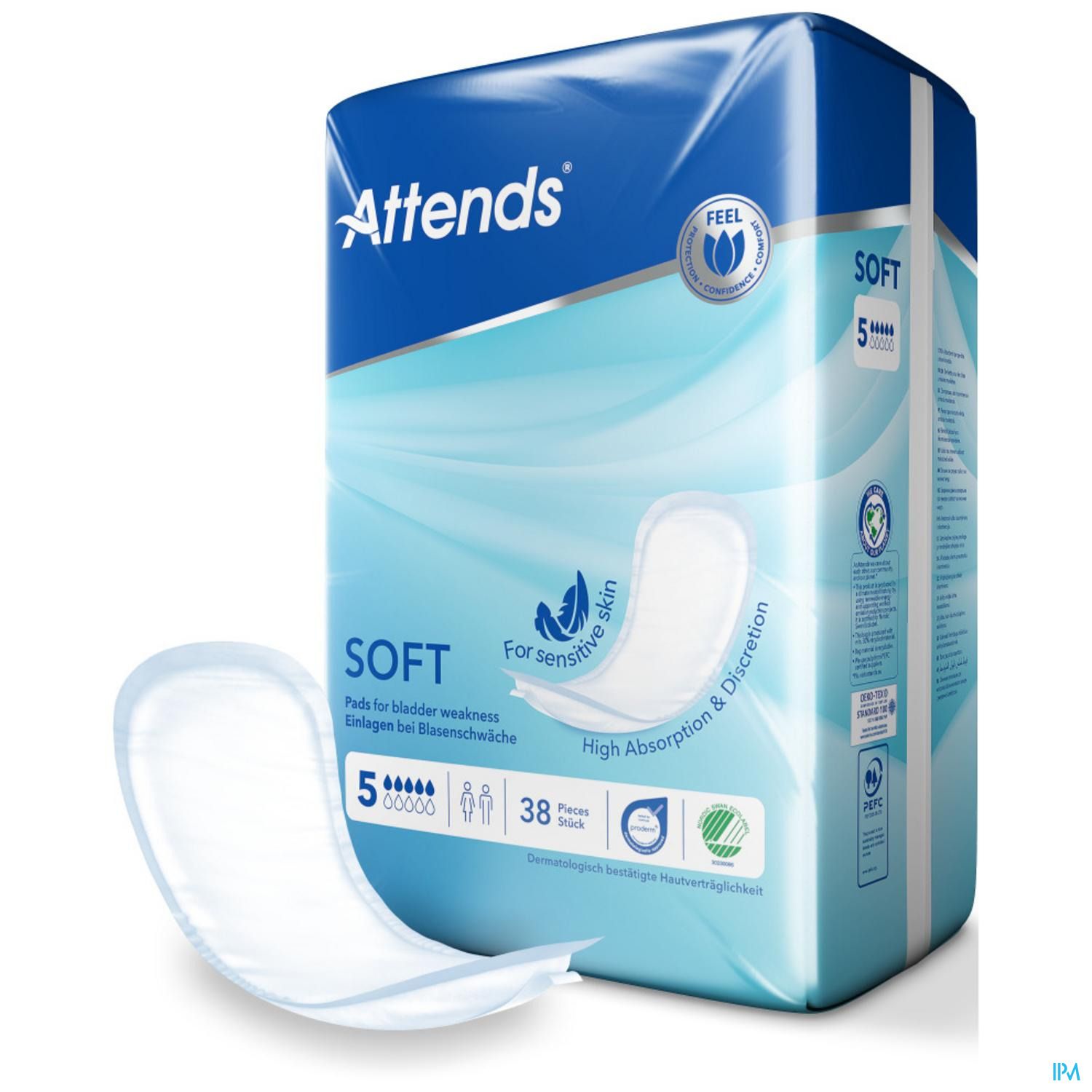 De nieuwe Attends Soft 4 en 5 zijn comfortabele, zachte en dunne inleggers. De producten hebben een natuurlijke pasvorm voor een perfecte aansluiting op het lichaam. De zachte, elastische beschermrandjes bieden extra zekerheid tegen lekkage.