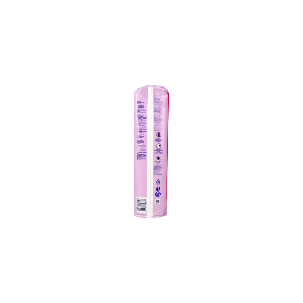 Dermatologisch getest vlies van synthetische vezels (polypropyleen), een distributielaag van synthetische vezels (polypropyleen) om het vocht af te voeren, een absorberende kern van plantaardige cellulosevezels, een onderlaag van synthetische vezels (polyethyleen) die het ondergoed beschermt, een papieren strook die de kleefband beschermt (met siliconen gecoat papier).