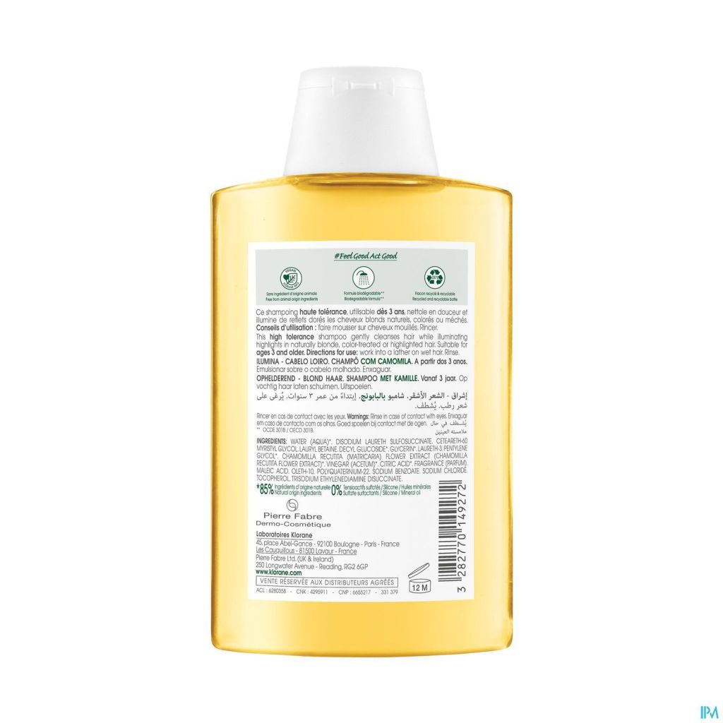 De Klorane Blonde Highlights verhelderende en verzachtende shampoo met medicinale Kamille, te gebruiken vanaf 3 jaar, reinigt het haar zacht en voegt een natuurlijke gouden glans toe aan natuurlijk blond, gehighlight of gekleurd haar. De formule is biologisch afbreekbaar* en bestaat voor 87% uit ingrediënten van natuurlijke oorsprong. Met een hoge tolerantie wast deze het haar op milde wijze. Het haar wordt subtiel lichter en krijgt een prachtige gouden glans, voor zacht, schoon, licht en stralend haar. Kamille, rijk aan natuurlijke gele pigmenten, wordt traditioneel gebruikt om alle blondtinten zachtjes te verlichten.