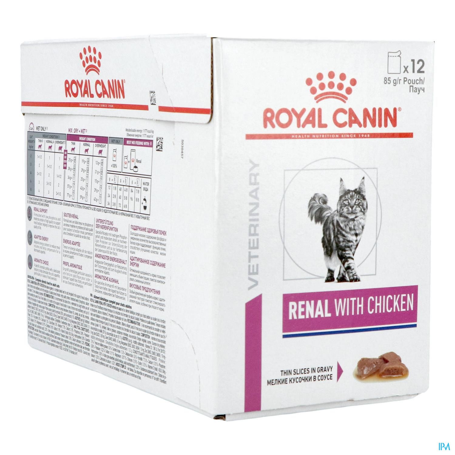 ROYAL CANIN® RENAL WITH CHICKEN dunne plakjes in jus is een volledig dieetvoeder voor katten dat is samengesteld om de nierfunctie te ondersteunen bij chronische nierinsufficiëntie, door zijn beperkte gehalte aan fosfor en hoogwaardige eiwitten. RENAL WITH CHICKEN is ook geformuleerd om de vorming van oxalaatstenen te verminderen door zijn lage calcium- en vitamine D-gehalte en zijn urine-alkaliserende eigenschappen. AANBEVELINGEN: Het wordt aanbevolen om voor gebruik of voor verlenging van de gebruiksperiode het advies van een dierenarts in te winnen. Voer in eerste instantie RENAL MET KIP tot 6 maanden bij chronische nierinsufficiëntie en vermindering van de vorming van oxalaatstenen.