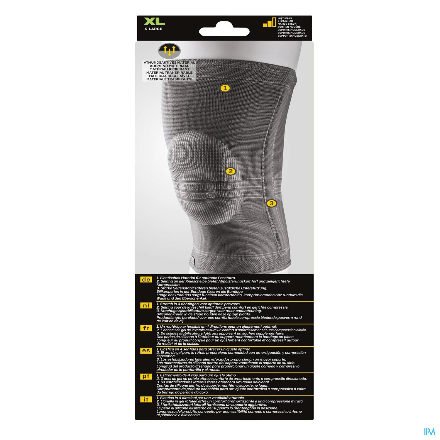 Kniebandage – gesloten patellaAnatomische pasvorm Zeer stevig multi-elastisch (3D) breiwerk Extra soepele boven- en onderrand Zijdelingse versteviging met baleinen Ingewerkte siliconenring rond gesloten patella
